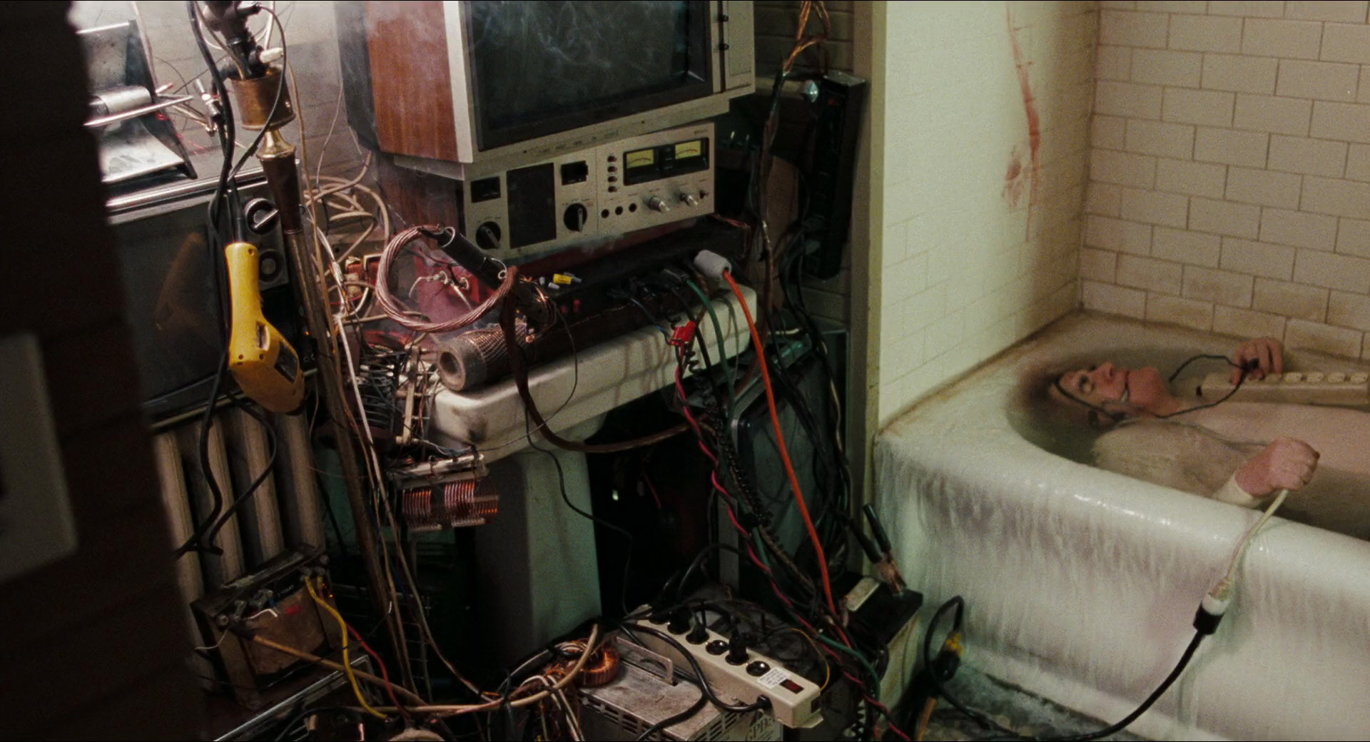 This choice always stood out when comparing the two films. While it removes an ounce of the original film's supernatural narrative, Noah is a character shown to be cemented to the film's focus on physical media. Verbinski emphasizes the cold and gray interiors of Noah's apartment, which doubles as his video engineering workspace that accentuates his connection to be with the physical instead of the metaphysical. Verbinski also features scenes of a separate broadcast station setting, in which Rachel uses analog racked AV equipment to manually stretch the cursed tape to attempt to identify clues that may point to its origin. Verbinski places focus on the characters as they work the controls and uses the clicks and static whir as accompanying audio that keeps the audience intimate with the physical analog environment. These characters are shown to interact with technology as a means of searching for truth in the static as they combat the spread of the cursed media itself.